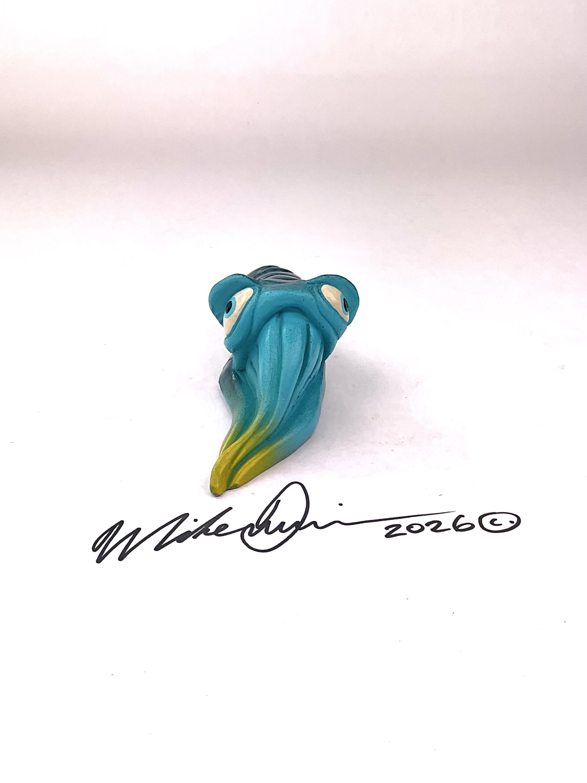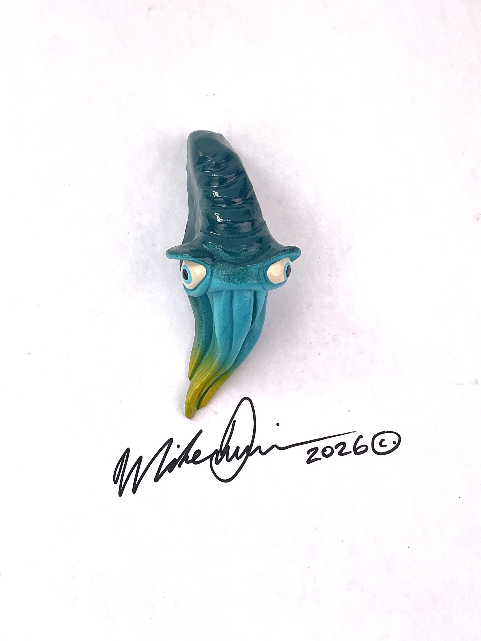 This witty little squid spends most of his days making Rorschach tests. Sadly no one understands him or his art. He measures 5” x 2.5” and hangs on the wall with a built-in hook. He’s sporting a hand-painted custom finish that is designed for indoor use or outside in a protected/covered area.