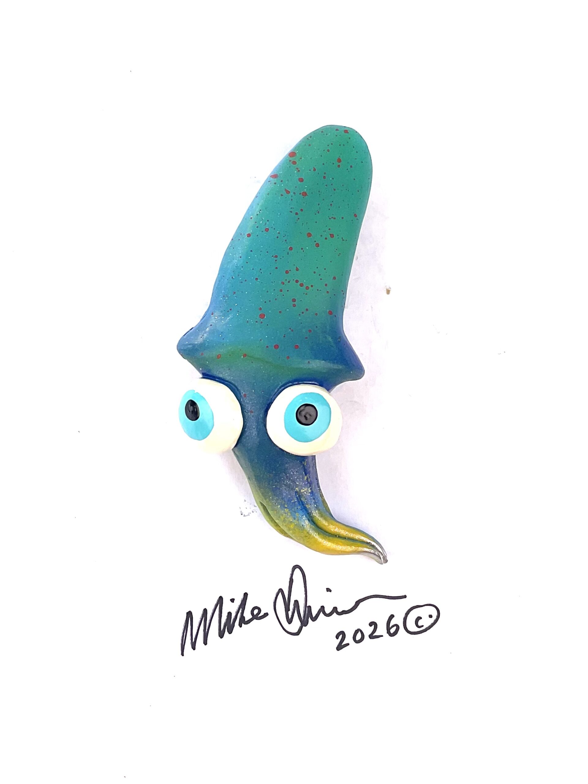 This squishy little squid is named “Stinky Mel”, he features an oversized head, buggy eyes and so much personality you just want to squeeze him! Stinky Mel is a fun guy but unfortunately, he’s pretty gassy…if he laughs to hard you get a stinky inky situation. He measures 2.5″ x 6″ and hangs on the wall with a built in eyelet. He’s sporting a hand painted custom finish that is designed for indoor use or outside in a protected/covered area.