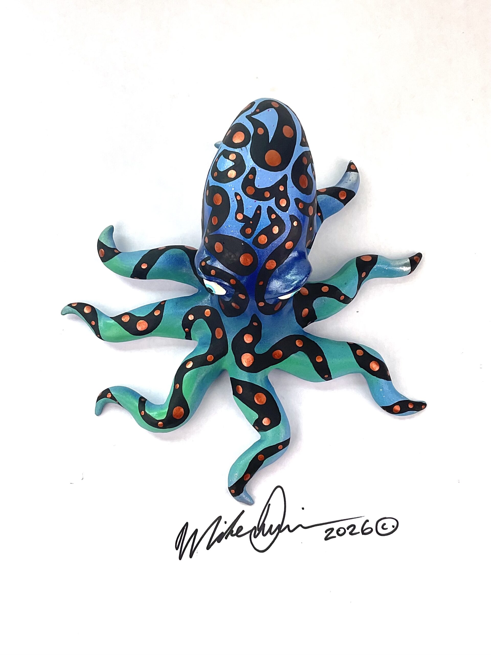 This snazzy octopus is named “Steve Oh”. An elusive predator of the business world, he’s got 8 legs and owns 9 businesses! His motto is to buy low and sell high. He’s sporting a hand-painted custom finish that is designed for indoor use or outside in a protected/covered area.