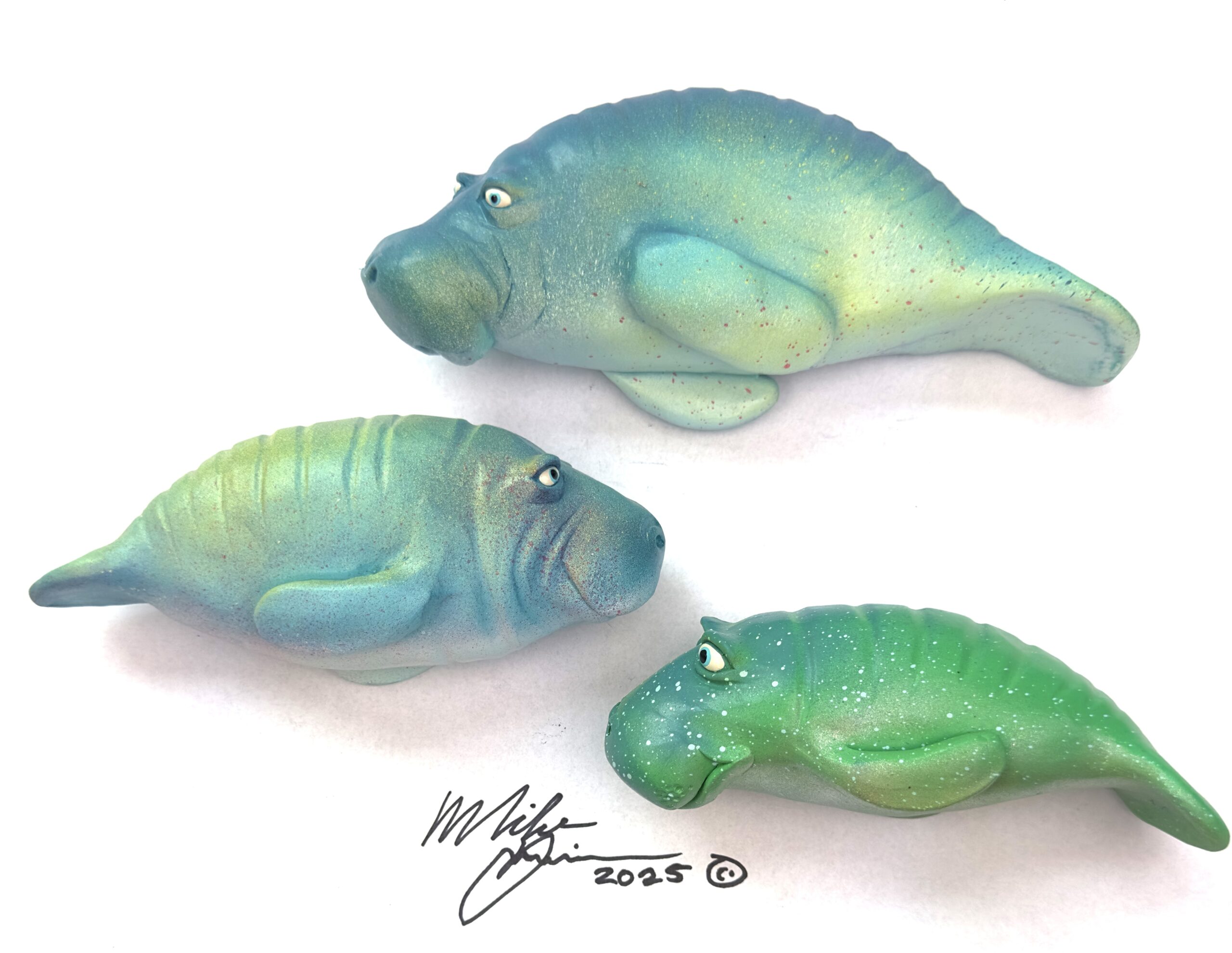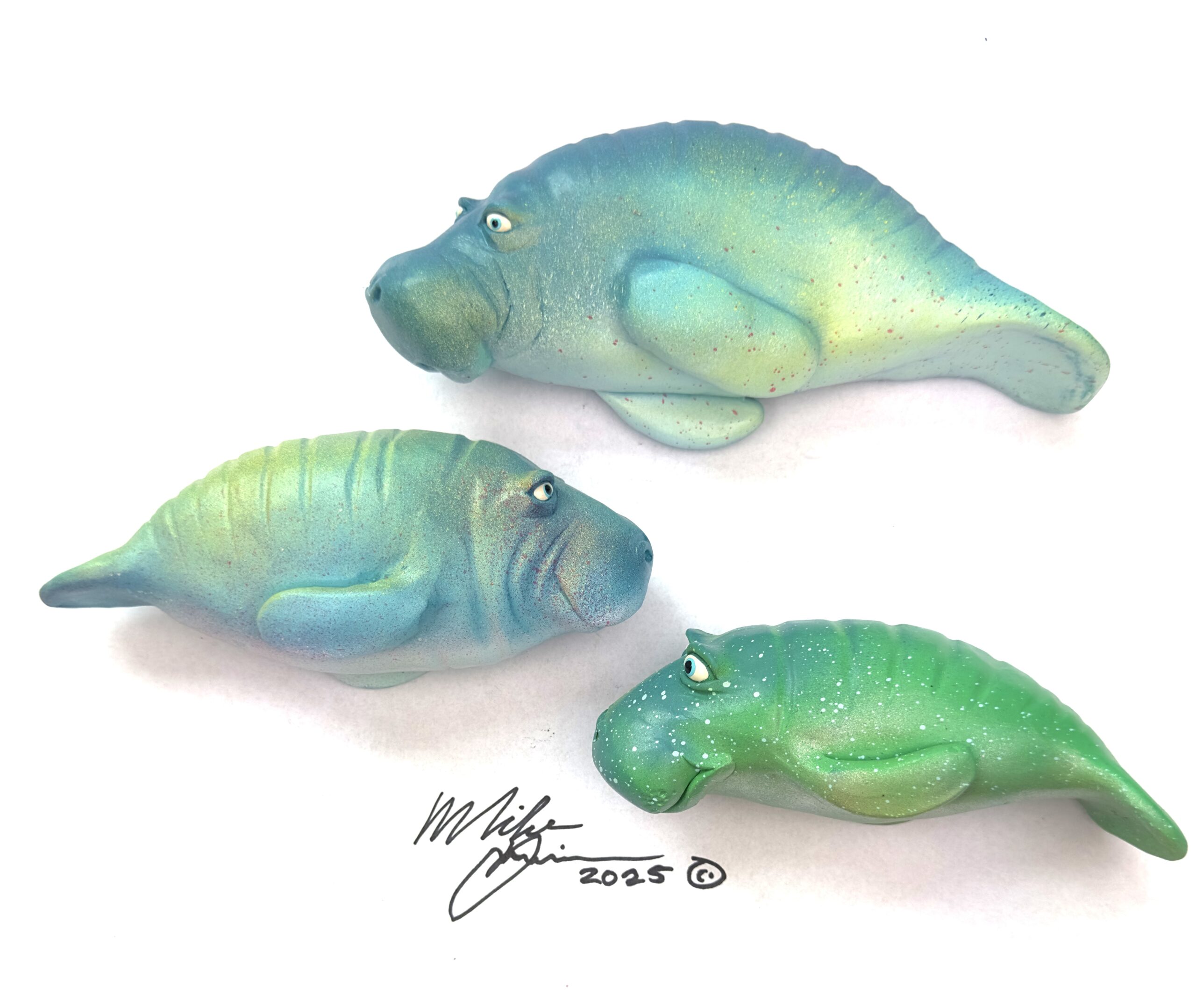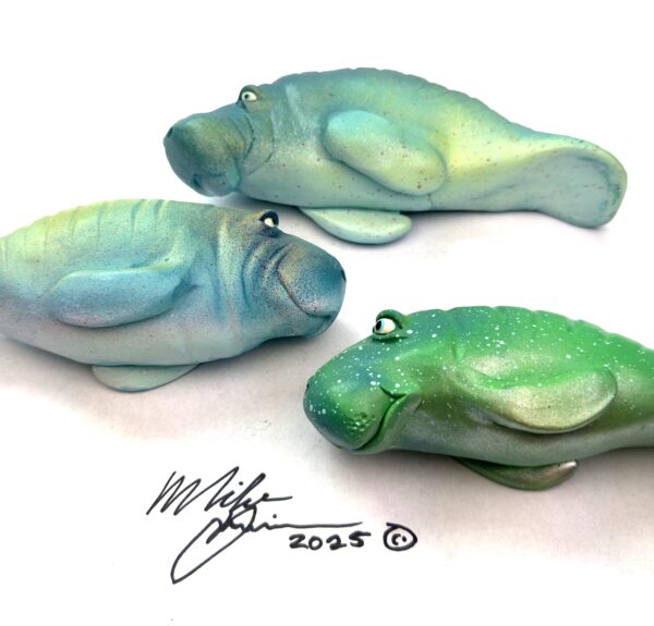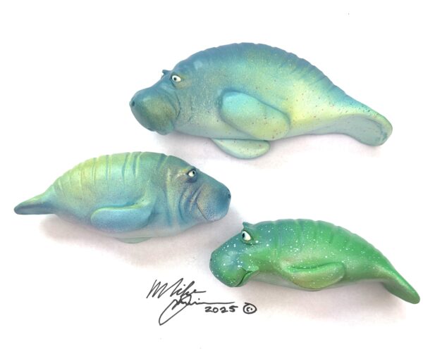 Papa Snooty is usually found grazing in the shallow bays of Bradenton, Fl. Momma Snooty is a devoted wife and mother. Spending most of her time doing the laundry, dishes and decorating the reefs nearby. Little Snooty is really rather shy, but when she hears her favorite song on the radio she can’t help to dance. She’s sporting a hand-painted custom finish that is designed for indoor use or outside in a protected/covered area.