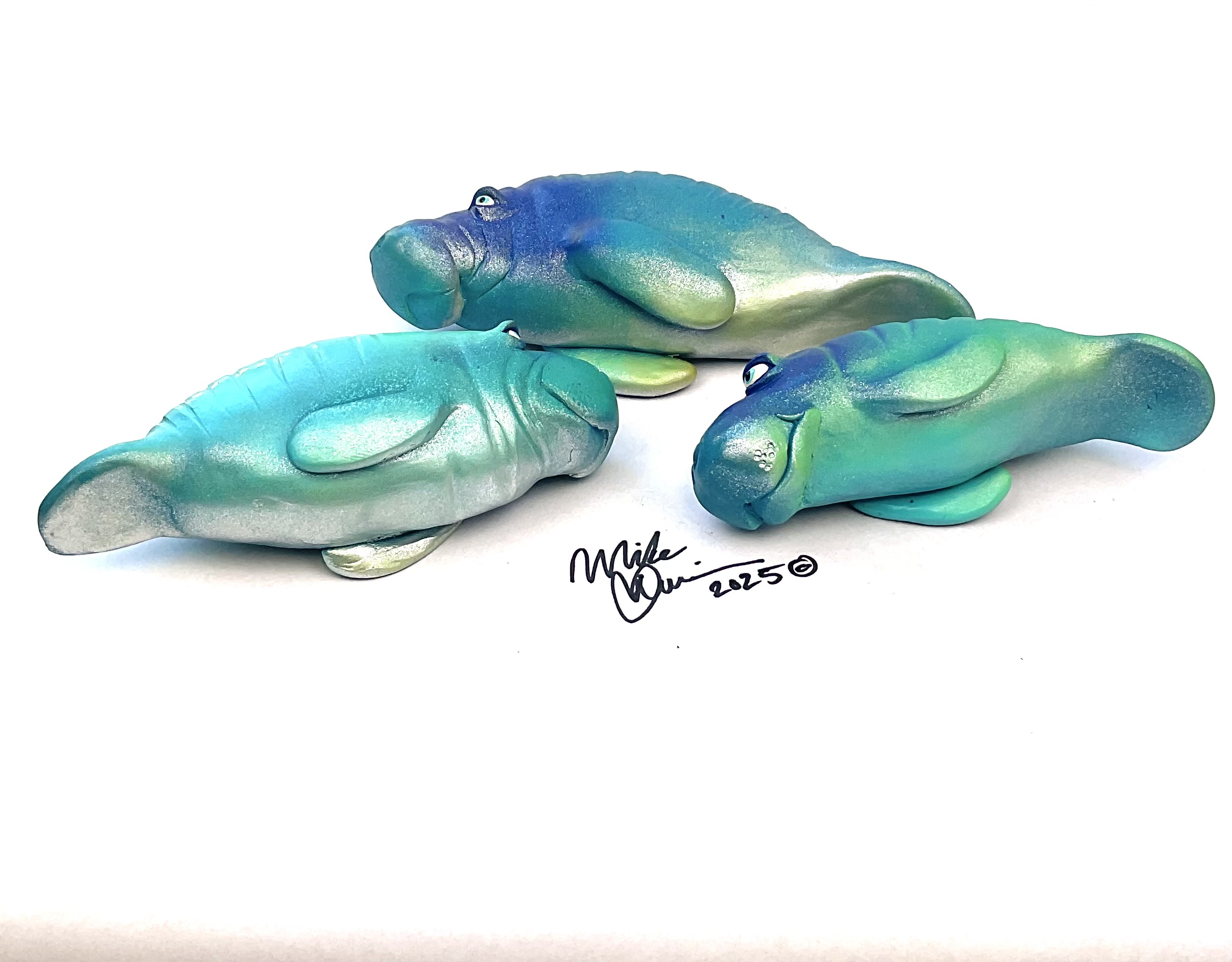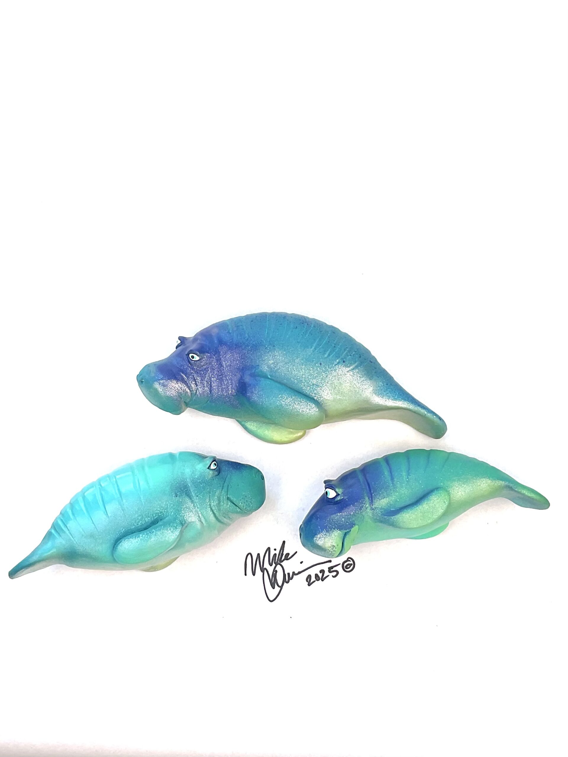Papa Snooty is usually found grazing in the shallow bays of Bradenton, Fl. Momma Snooty is a devoted wife and mother. Spending most of her time doing the laundry, dishes and decorating the reefs nearby. Little Snooty is really rather shy, but when she hears her favorite song on the radio she can’t help to dance. She’s sporting a hand-painted custom finish that is designed for indoor use or outside in a protected/covered area.