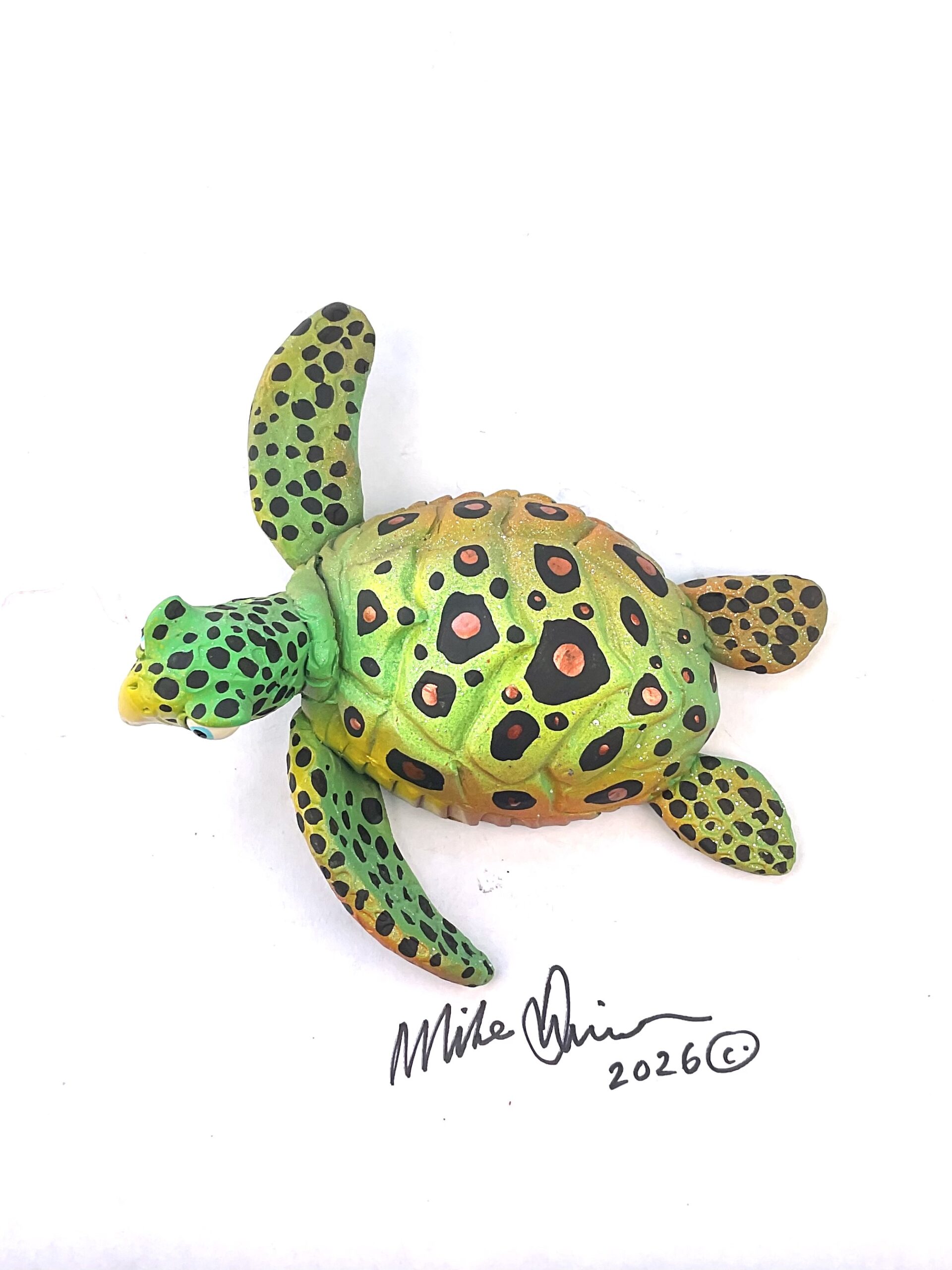 Timmy is a New Style for 2026!! He’s happy to be in the Collection of Artist Mike Quinn’s Sea Turtles!!! He measures 7.5″ x 7″ x 2″ and hangs on the wall with a built-in hook. He’s sporting a hand-painted custom finish that is designed for indoor use or outside in a protected/covered area.