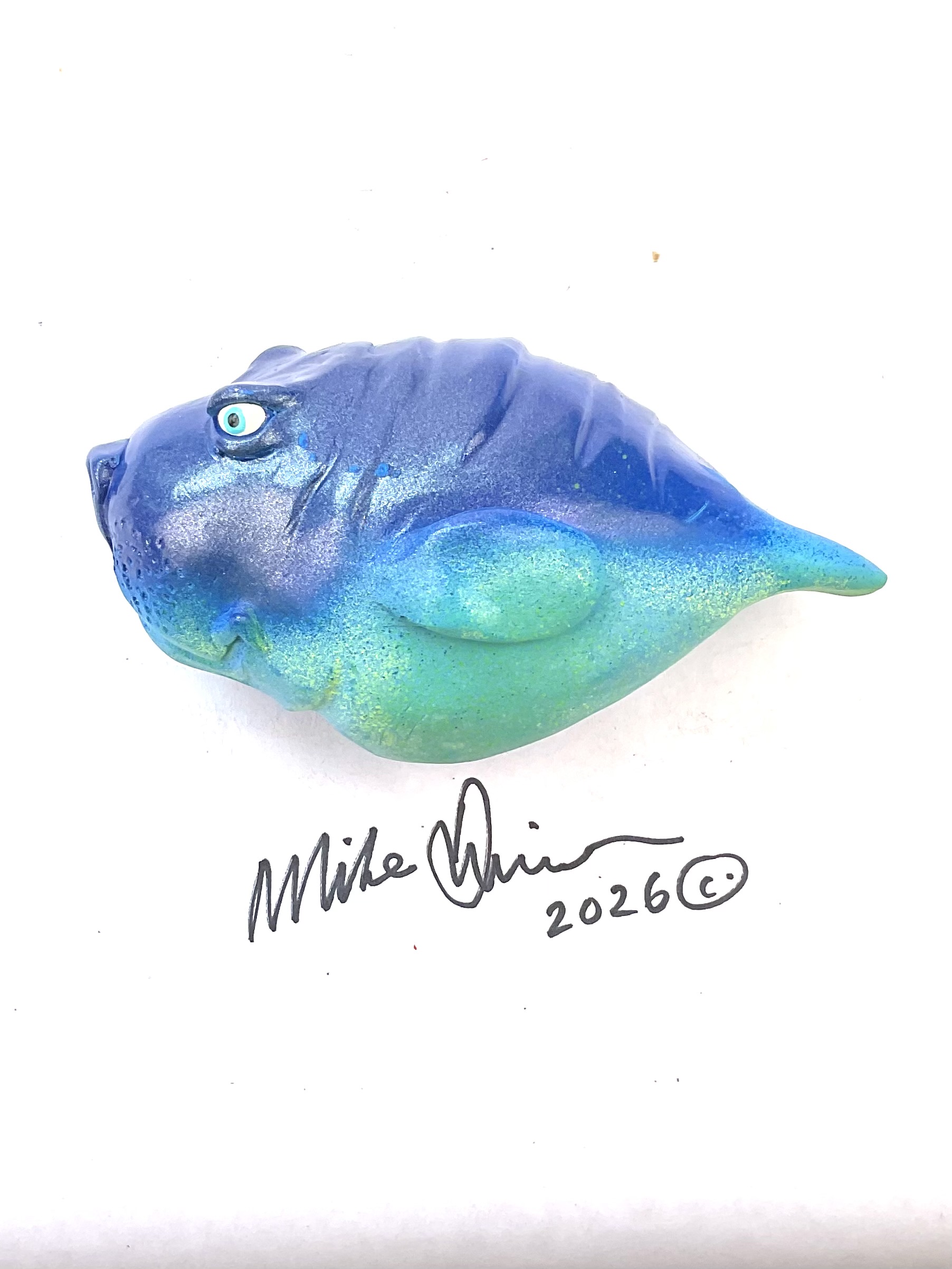 This piece is designed and created by artist Mike Quinn, it’s part of his Fish with Attitude collection. Its one-of-a-kind nature means it will have unique markings, design, spots, teeth, fur, claws or whatever is applicable to the creature posted.