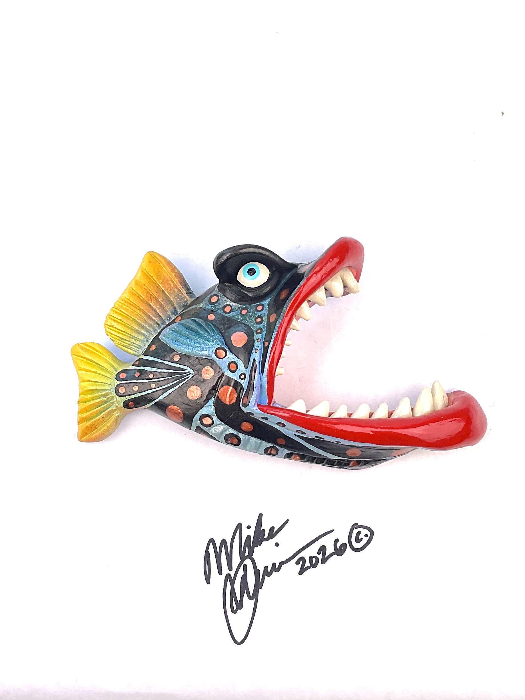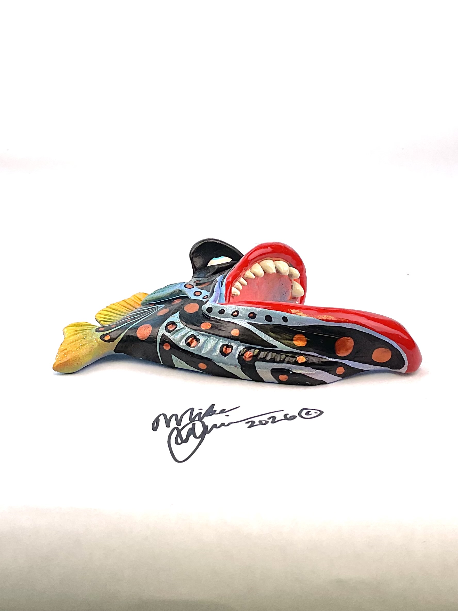 This piece is designed and created by artist Mike Quinn, it’s part of his Fish with Attitude collection. It’s one of a kind nature means it will have unique markings, design, spots, teeth, fur, claws or whatever is applicable to the creature posted.