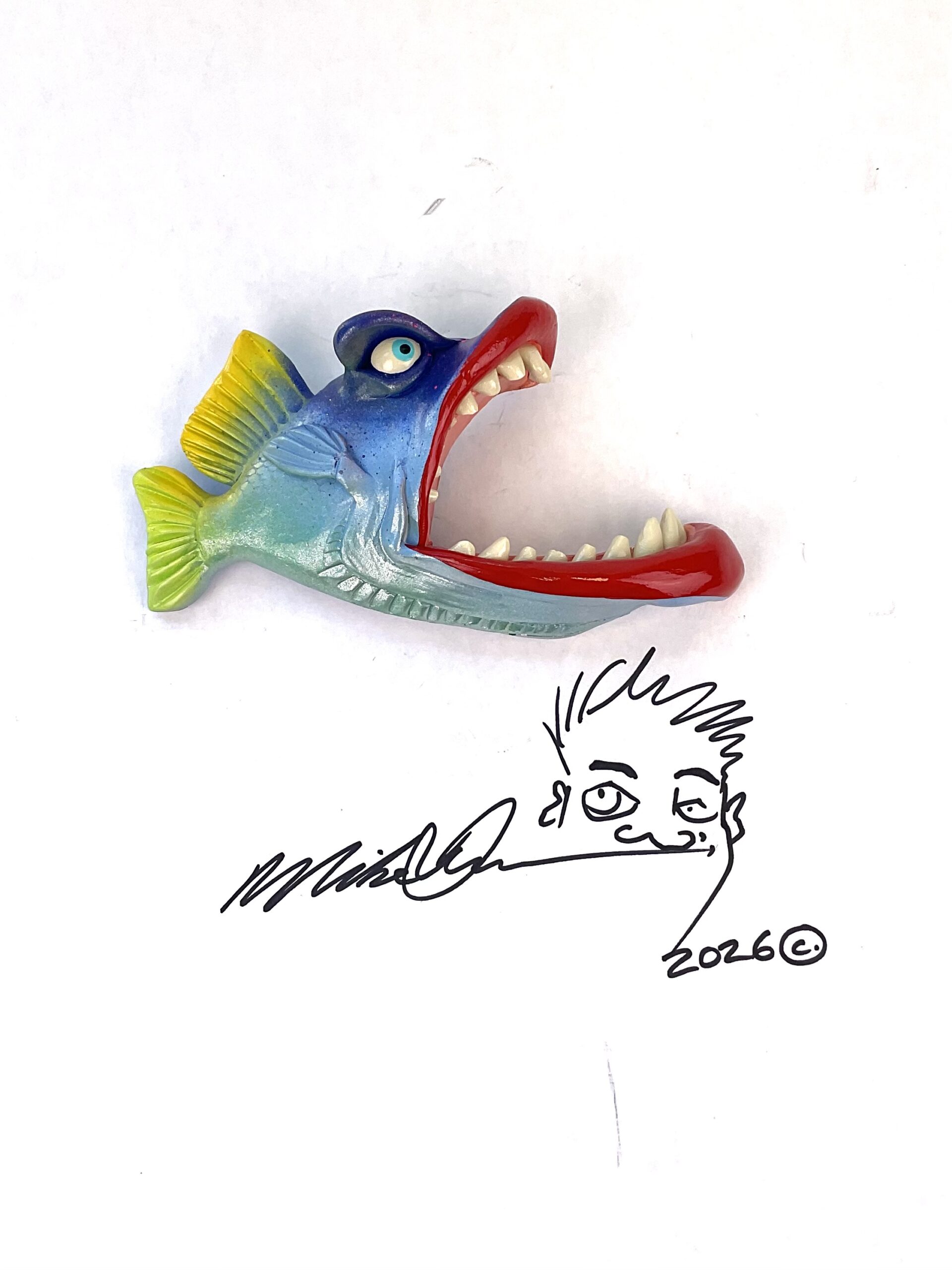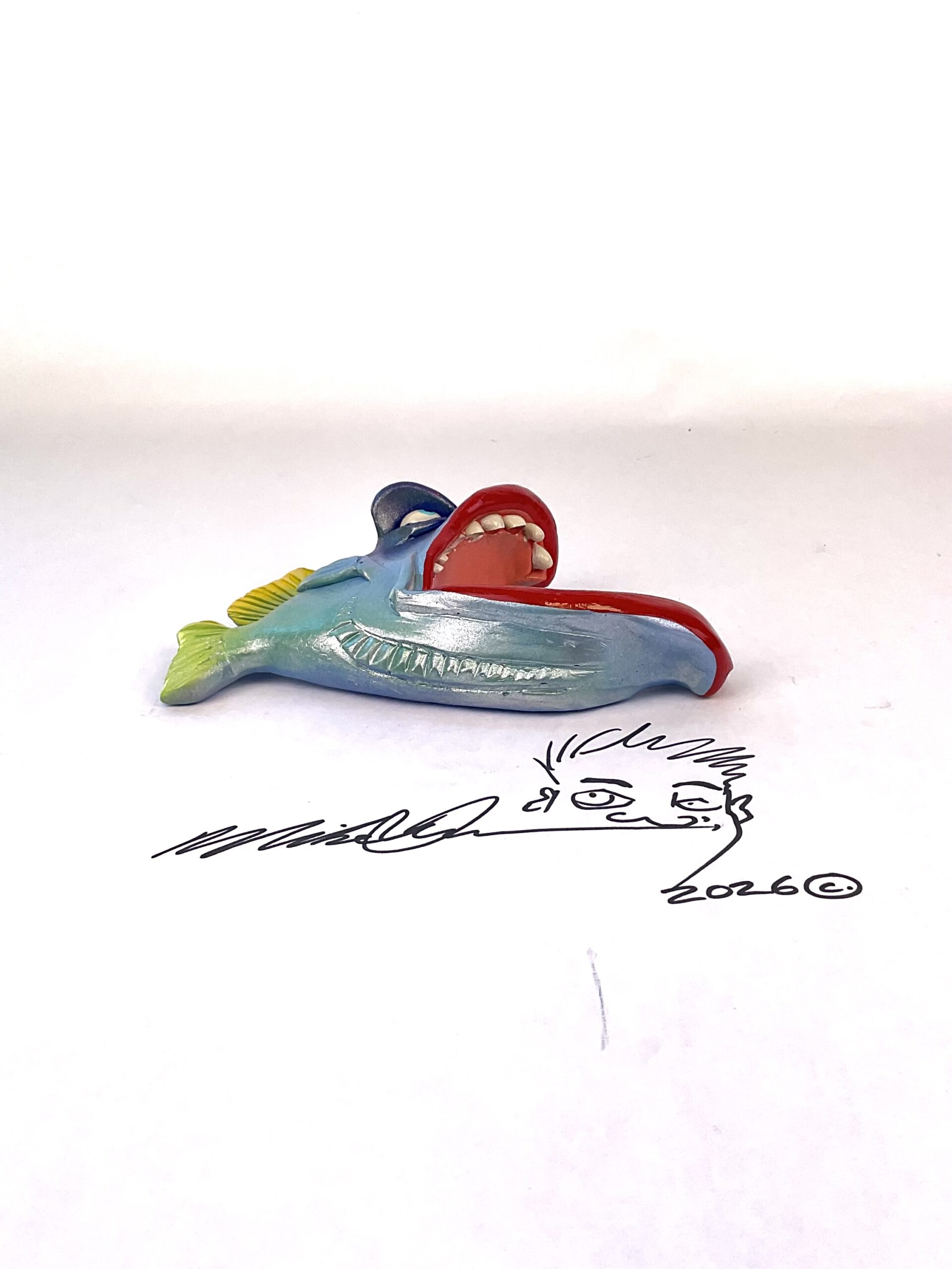 This piece is designed and created by artist Mike Quinn, it’s part of his Fish with Attitude collection. It’s one of a kind nature means it will have unique markings, design, spots, teeth, fur, claws or whatever is applicable to the creature posted.
