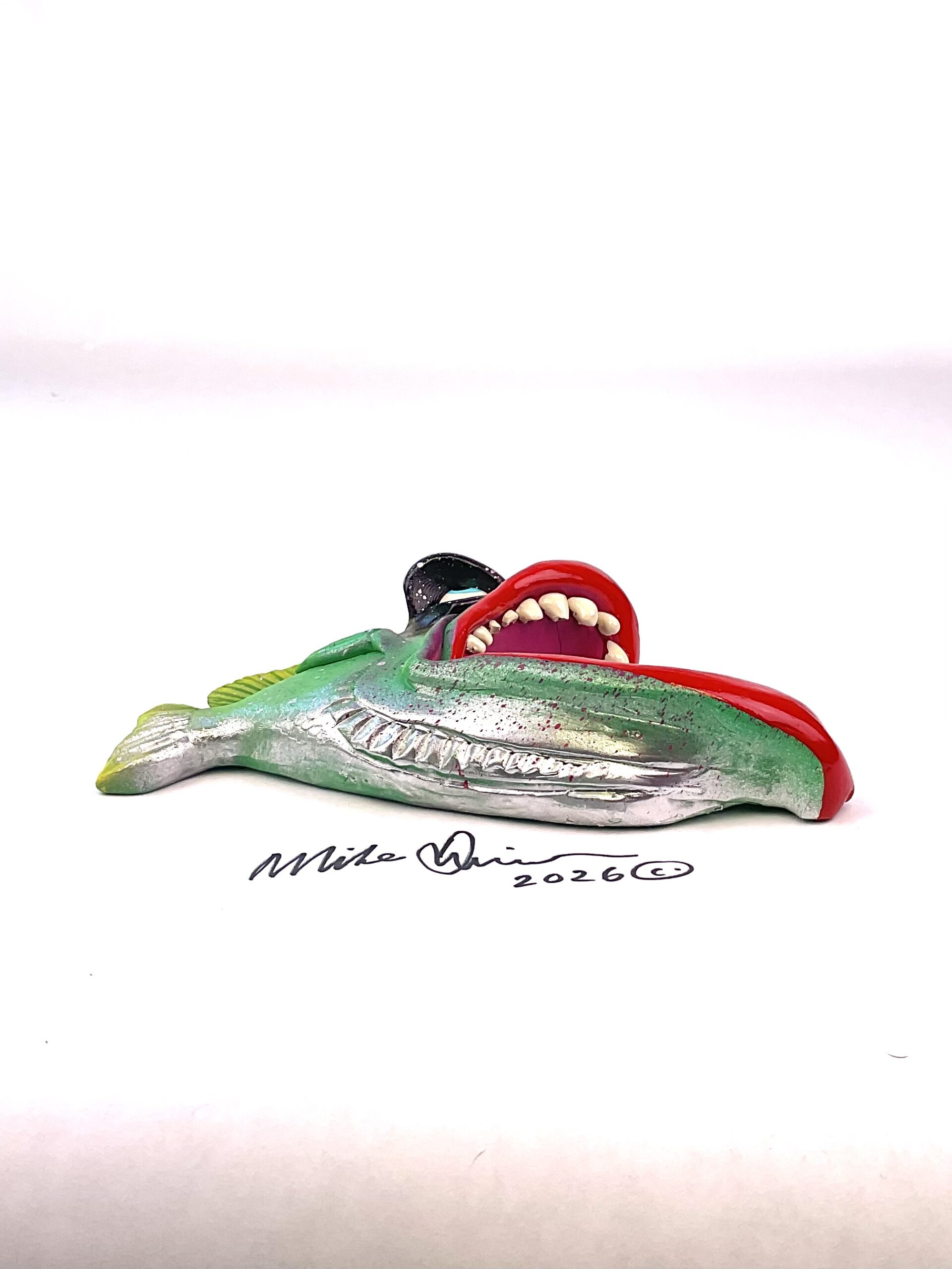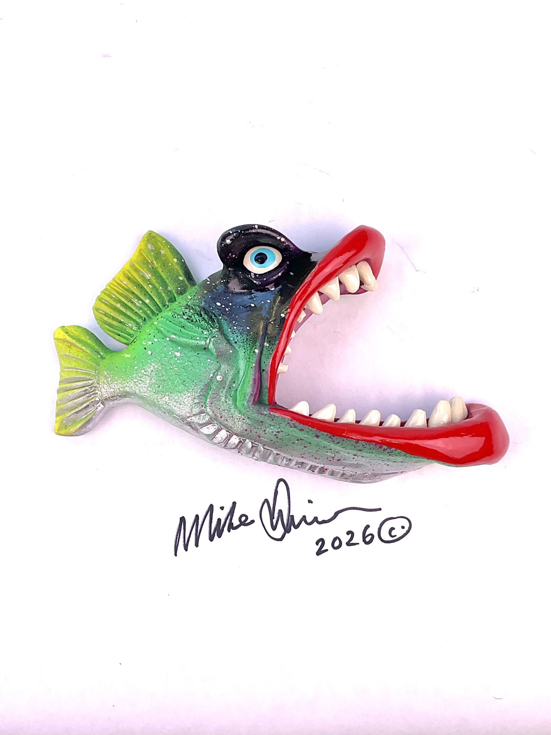 This piece is designed and created by artist Mike Quinn, it’s part of his Fish with Attitude collection. It’s one of a kind nature means it will have unique markings, design, spots, teeth, fur, claws or whatever is applicable to the creature posted.