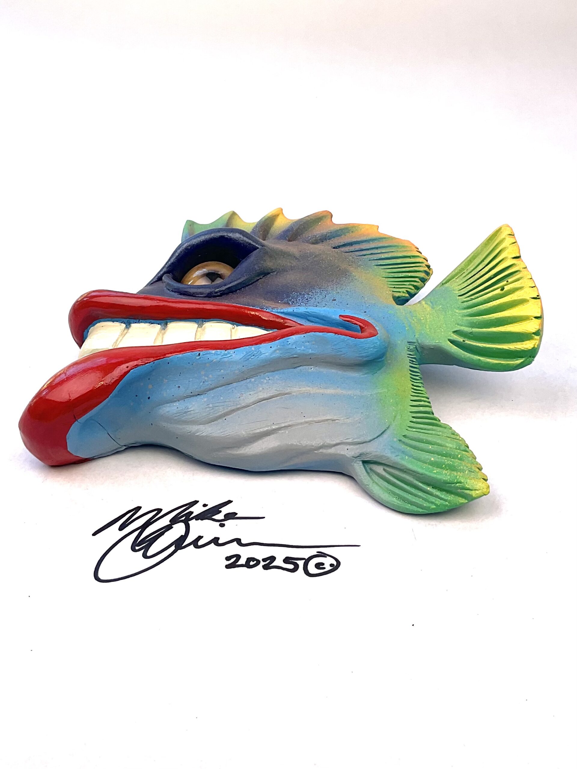 This piece is designed and created by artist Mike Quinn, it’s part of his Fish with Attitude collection. It’s one of a kind nature means it will have unique markings, design, spots, teeth, fur, claws or whatever is applicable to the creature posted.