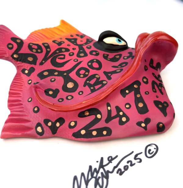 This piece is designed and created by artist Mike Quinn, it’s part of his Fish with Attitude collection. It’s one of a kind nature means it will have unique markings, design, spots, teeth, fur, claws or whatever is applicable to the creature posted.