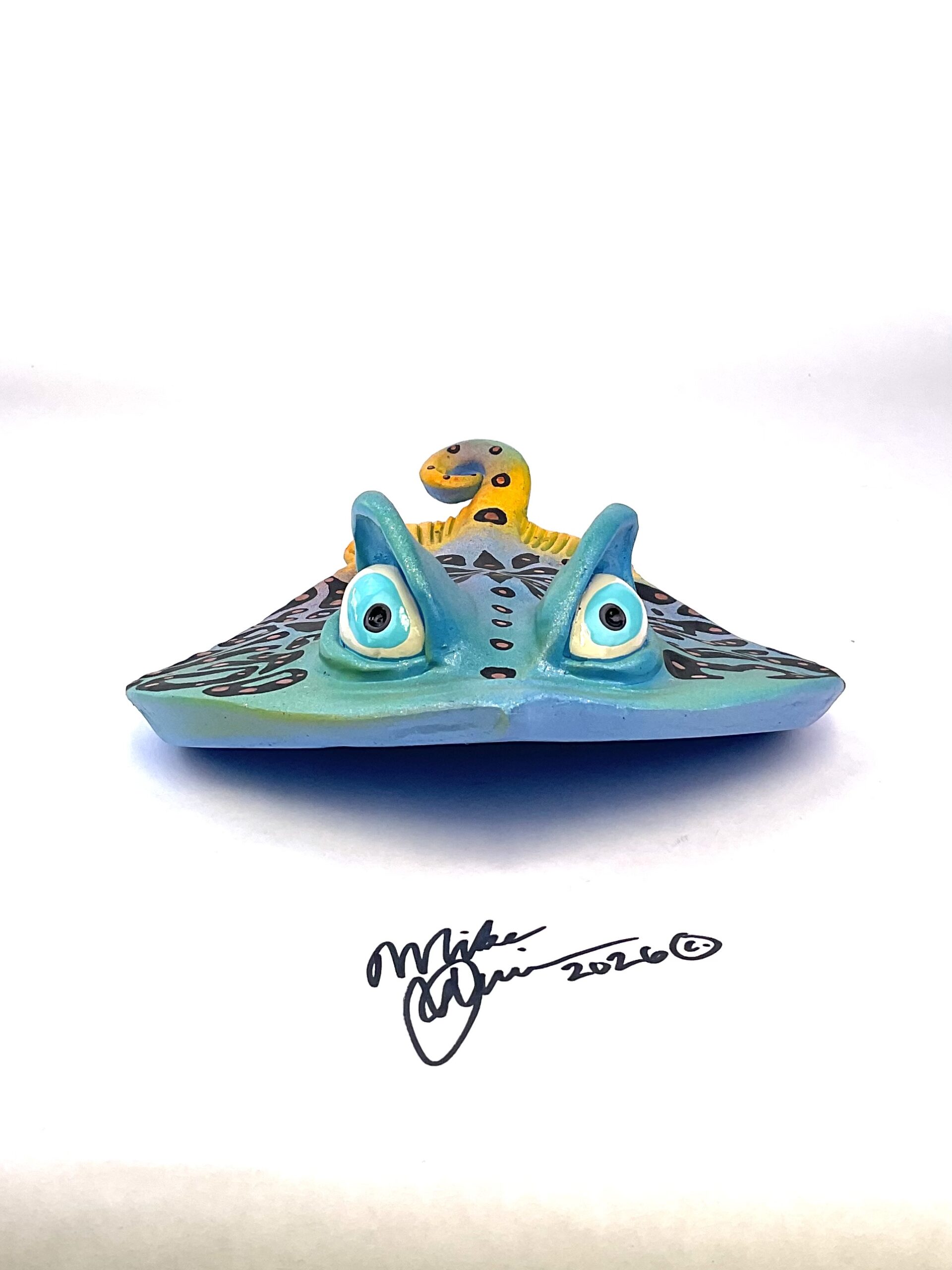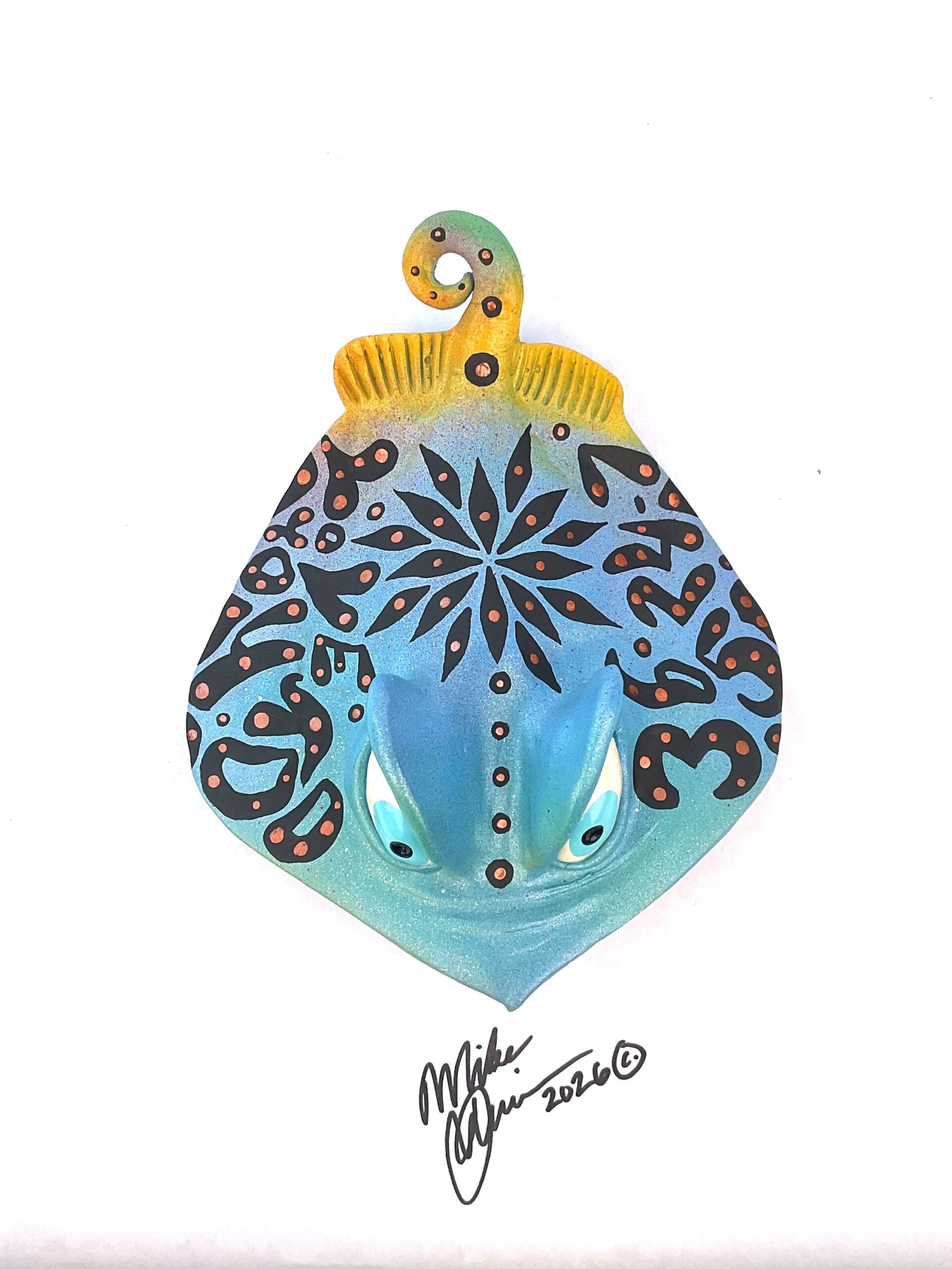 This devious stingray is named Oscar, he features buggy eyes and so much personality you just want to avoid him…he looks like trouble! Oscar spends his days cruising the reef, he manages the synchronized swimming team on the weekends. He measures 7.5″ x 10″ and hangs on the wall with a built-in hook. He’s sporting a hand-painted custom finish that is designed for indoor use or outside in a protected/covered area.